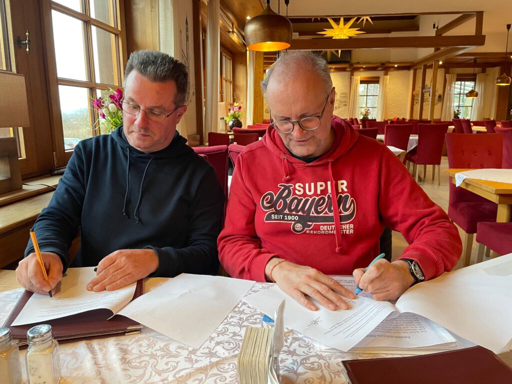 Steffen und Andreas bei der Unterschrift des erforderlichen Vertrages